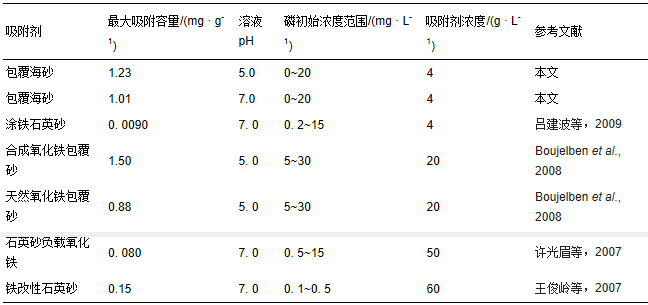 基于Freundlich吸附模型的假定條件推斷,包覆海砂對磷的吸附為多分子層吸附,最大吸附容量為1.01 mg · g-1(pH 7.0)與1.23 mg · g-1(pH 5.0),比包覆前海砂的磷最大吸附容量0.07 mg · g-1(pH 5.0)提高了13~17倍. 根據包覆海砂中鐵錳復合氧化物的含量為2.5%,計算包覆海砂的鐵錳復合氧化物的磷最大吸附容量為37.6 mg · g-1(pH 7.0)與46.4 mg · g-1(pH 5.0),顯著高于前期研究中粉末狀鐵錳復合氧化物的磷最大吸附容量36 mg · g-1(pH 5.6)(Zhang et al., 2009),表明鐵錳復合氧化物包覆海砂不僅能實現鐵錳復合氧化物的固定化,易于填充在吸附柱或吸附罐內用于污水除磷,而且能充分發揮粉末狀鐵錳復合氧化物的磷吸附性能. 此外,與文獻中報道的負載改性砂顆粒吸附劑相比(見表 3),鐵錳復合氧化物包覆海砂具有較強的磷吸附優勢.