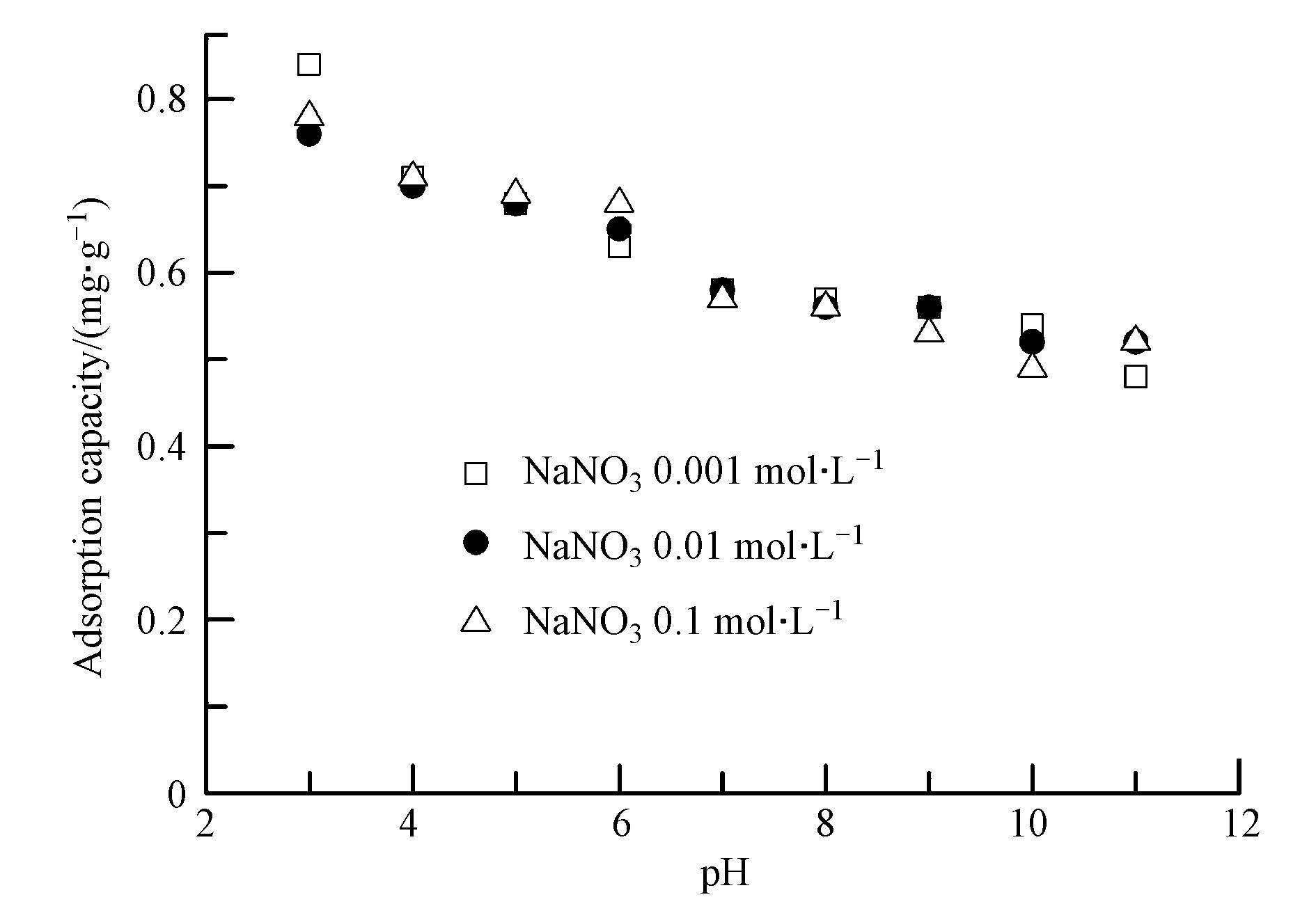 配制一系列50 mL濃度為5.0 mg · L-1磷溶液,分別投加200 mg吸附劑,考察不同pH(3.0~11.0)和不同離子強度(0.1 mol · L-1,0.01 mol · L-1,0.001 mol · L-1 NaNO3)對吸附磷的影響. 用HNO3和NaOH調節溶液pH,使pH穩定在不同預定值.