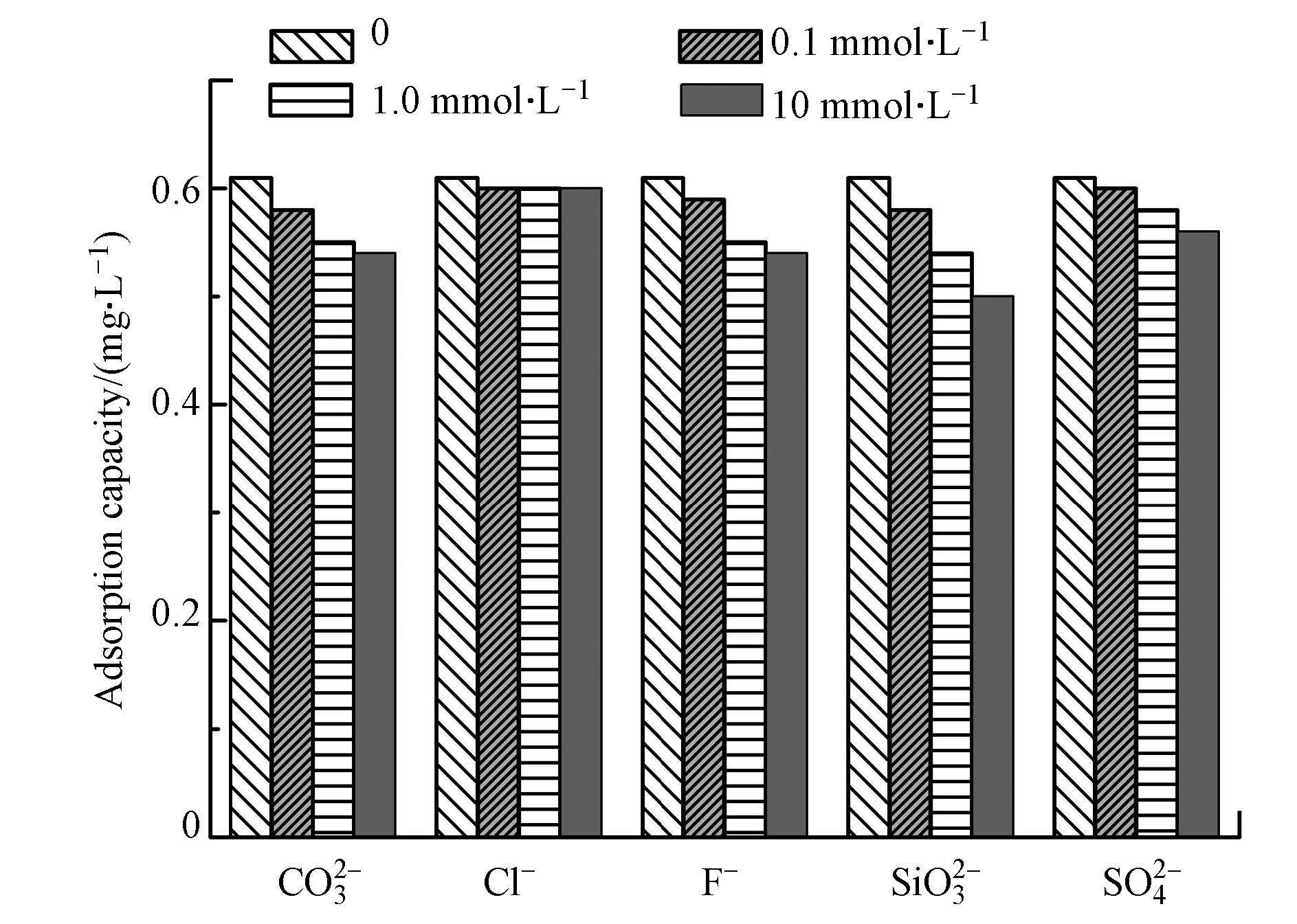 配制一系列50 mL濃度為5.0 mg · L-1磷溶液,溶液pH 7.0±0.1,分別投加200 mg吸附劑,考察Cl-、F-、CO32-、SO42-與SiO32- 5種陰離子在4種不同濃度(0 mmol · L-1,0.1 mmol · L-1,1.0 mmol · L-1,10 mmol · L-1)時對吸附磷的影響.