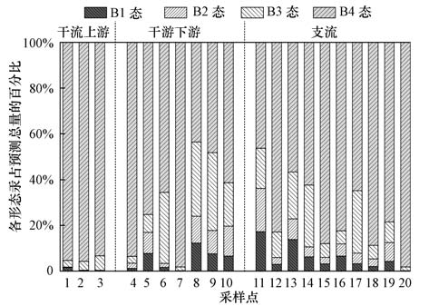 由圖 2可知,涼水河表層沉積物中各形態汞含量存在差異,在涼水河干流上游、干流下游及支流表層沉積物中均以B4態為主要賦存形態,其中B4態所占比例均值分別為94.81%、69.41%和74.89%,平均百分比為75.96%;B3態所占比例均值分別為4.40%、18.40%和13.20%,平均百分比為13.70%.總體來看,在涼水河干流上游、干流下游及支流表層沉積物中,汞各形態所占比例大小順序均為B4>B3>B2>B1.涼水河表層沉積物中汞主要以B4態存在,表明涼水河表層沉積物中汞的生物可利用性低.