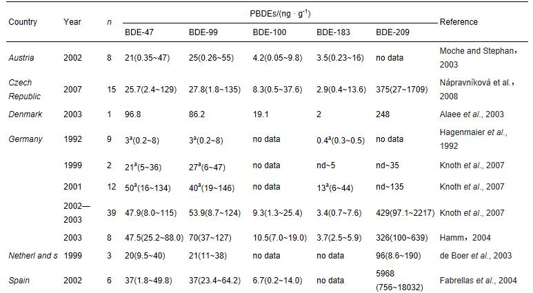 自從1988年第一篇關于瑞典污泥中PBDEs的文章報道之后,世界各地關于污泥中PBDEs的研究報道越來越多.我們在這里對世界各地已發表的文章進行了總結,如表 3所示.這樣有助于我們進一步的對比研究.從表中可以看出,王等(2007b)在2005年采集了中國26個城市污水處理廠的31分污泥樣品進行分析,他們發現∑PBDE(12種三溴到七溴的同系物之和)和BDE-209的濃度分別為19.6和68.5 ng · g-1. Peng等(2009)采集了珠江三角洲的污泥樣品進行分析,發現其中三溴到七溴同系物濃度之和為46.9 ng · g-1,而BDE-209高達6586 ng · g-1.Yang等(2011)則采集了上海市的污泥樣品進行分析,發現其中三溴到七溴同系物濃度之和為67.0 ng · g-1,BDE-209的濃度高達2370 ng · g-1.這些報道結果的差異表明,由于不同區域的社會經濟結構的不同,這些區域對商業PBDEs的消費類型也不同.