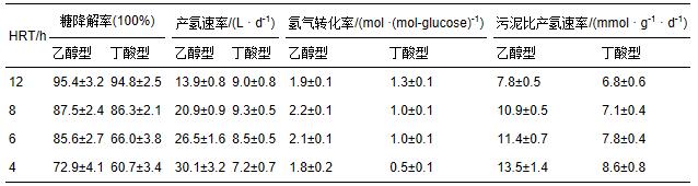 表1 對比分析不同HRT下ACR乙醇型和丁酸型發(fā)酵系統(tǒng)產(chǎn)氫性能