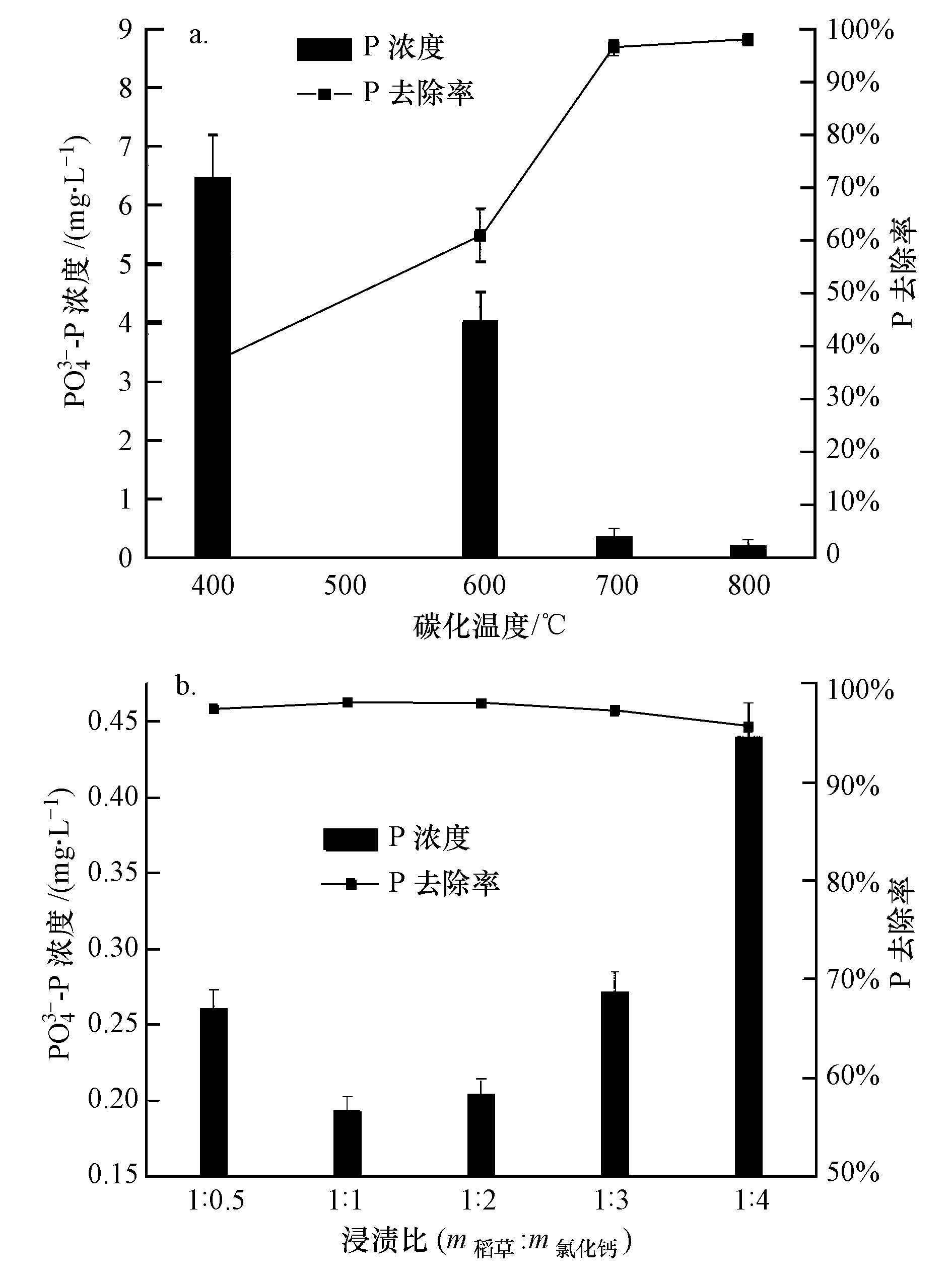 圖2 碳化溫度(a)和浸漬比(b)對稻草秸稈炭吸P性能的影響(溶液初始濃度10.30 mg · L-1(以P計),吸附時間 720 min,稻草秸稈炭用量4.0 g · L-1)