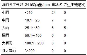 生長期內(nèi)共有37場次降雨,降雨強度等級見表 2(科迪,1995).其中,小雨條件下均未產(chǎn)生出流;中雨條件下有3場降雨未產(chǎn)生出流,其中兩場降雨發(fā)生在曬田期,在此期間田間水位基本為零,降雨量未達到最低田埂高度,另外一場降雨前田面水水位維持在50 mm左右;大雨條件下,有一場未產(chǎn)生出流,此場降雨前田面水水位不足40 mm.