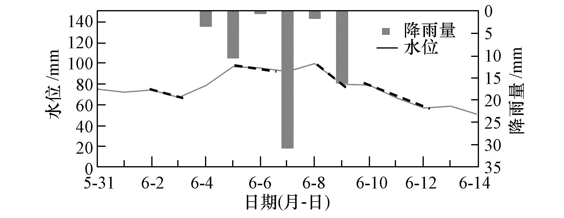 此外,試驗中采集水樣時,取樣的位置或者取水的深度不同,會對濃度測定結果造成一定的影響,因此,應該在取樣時規(guī)范操作,并保證每次取樣位置和取水深度一致;另外,水位觀測儀的記錄受到人為活動的干擾,若在水位計附近進行除草等活動,可能會對水位記錄產(chǎn)生影響,使記錄數(shù)據(jù)產(chǎn)生波動或者出現(xiàn)異常點,因此,在后續(xù)水位數(shù)據(jù)分析和處理過程中要注意對異常點的識別和剔除.