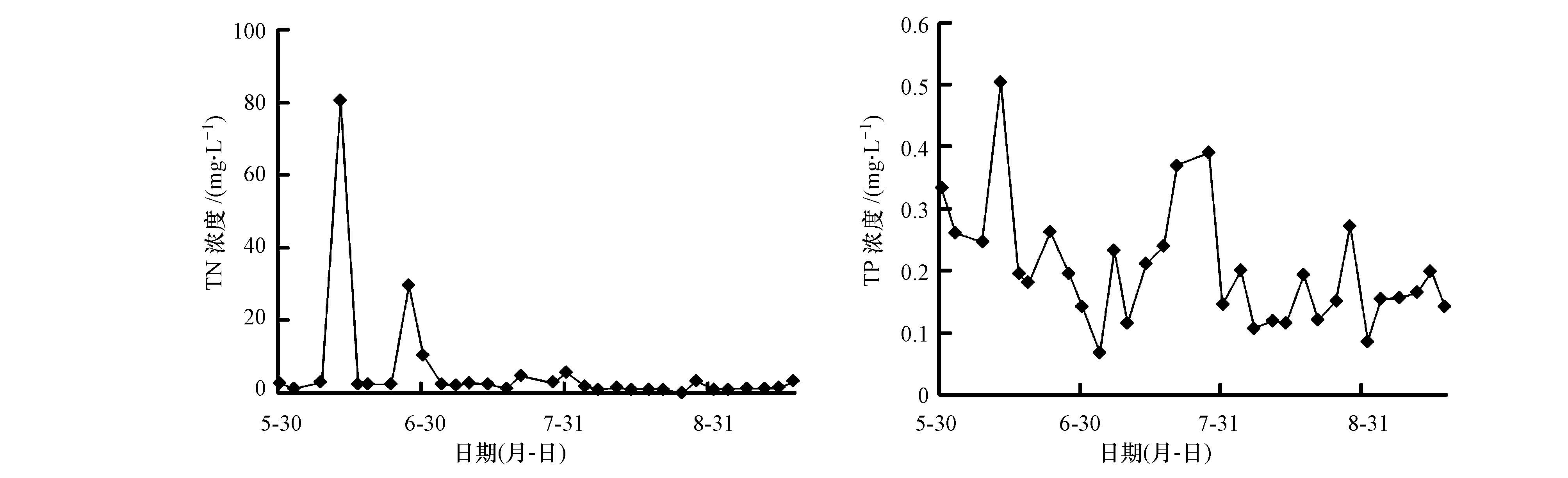 圖 5中TN濃度出現(xiàn)了兩次峰值,分別是在施用底肥和追施尿素后,底肥施用一定時間后,水中TN濃度升高至最大值,之后隨著水稻生長消耗或者降雨的稀釋濃度逐漸降低;施用底肥后未追施磷肥,所以TP濃度僅在施用底肥后出現(xiàn)峰值,之后有3次較高值出現(xiàn),與TN在7月份后出現(xiàn)較高值的日期基本一致.整體來看,TN濃度變化范圍遠大于TP濃度,濃度在出現(xiàn)峰值后趨于穩(wěn)定,但都呈現(xiàn)波動性變化,主要是受到水稻生長和肥料釋放等的影響.