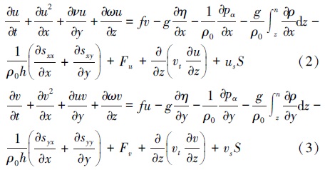 式中,t表示時間,x、y為笛卡爾坐標系坐標,η為水位,u、v分別為x、y方向上的速度分量,f是科氏力系數,f=2ωsinφ,ω為地球自轉角速度,φ為當地緯度,g為重力加速度,ρ為水的密度,sxx、sxy、syy分別為輻射應力分量,F為水平渦粘項,S為源項,us、vs為源項水流速度.
