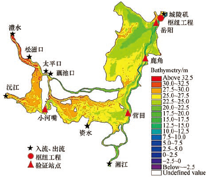 洞庭湖位于荊江南岸,北緯28°44′~29°35′、東經111°53′~113°05′之間,是由西洞庭湖、南洞庭湖和東洞庭湖組成的淺碟狀季節性調蓄湖泊.洞庭湖區屬亞熱帶季風氣候,氣候溫潤,雨量充沛,光熱充足,多年平均氣溫16.4~17.0 ℃,年降水量1200~1450 mm.洞庭湖承納由長江松滋口、太平口、藕池口(簡稱三口)分泄入湖的水量和洞庭湖本地流域湘江、資江、沅江、澧水(簡稱四水)的匯入,經湖泊調蓄后,由城陵磯一處重新匯入長江.洞庭湖與長江干流、上游河流流域之間通過上述河網水系相互聯接耦合,形成錯綜復雜、動態變化的江湖、河湖關系.洞庭湖年內不同時期水位漲落變幅較大,湖區水面動態變化明顯,洲灘漫露過程交替進行,有高水湖相、低水河相的特征.近年來,受流域降雨偏枯及三峽水庫蓄水等影響,洞庭湖干旱事件頻發,嚴重影響洞庭湖濕地生態環境,威脅候鳥等珍貴物種棲息地.為有效緩解洞庭湖枯水期旱情,解決洞庭湖季節性水資源短缺、枯水期提前及延長等問題,改善湖區供水、灌溉、濕地生態、航運、水產等條件,充分發揮洞庭湖的生態服務功能,湖南省和湖北省政府提出了建設城陵磯綜合樞紐工程,綜合考慮生態、水環境、供水、灌溉、航運等不同要求,城陵磯綜合樞紐工程采用“控枯不控洪”的調度方式運行.城陵磯綜合樞紐工程的建設將對洞庭湖水動力條件產生重要影響,引起社會廣泛關注與爭論.因此,有必要對樞紐工程的影響進行研究和論證.