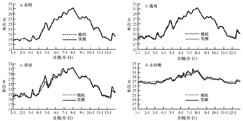 水動力模型驗證分別選取洞庭湖東、南、西湖區不同位置的岳陽、鹿角、營田、小河嘴4個站點(見圖 1)的實測水位與模擬水位進行對比,結果如圖 2所示.4個水文站點水位模擬的Nash效率系數依次為0.999、0.995、0.972、0.883,模擬效果較好.小河嘴站點誤差相對較大,可能由地形數據(1995年)誤差造成.水位模擬能夠反映洞庭湖湖區水位季節性變化特征,洲灘漫露交替過程,模擬結果真實可靠.