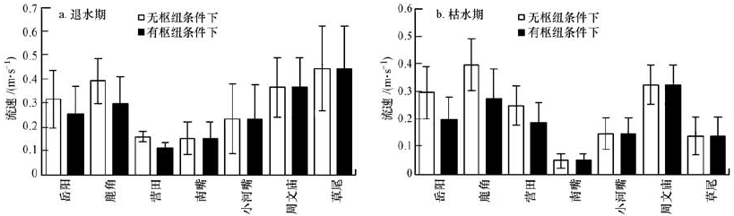 圖 5 城陵磯綜合樞紐建設前后洞庭湖退水期、枯水期典型站點流速對比