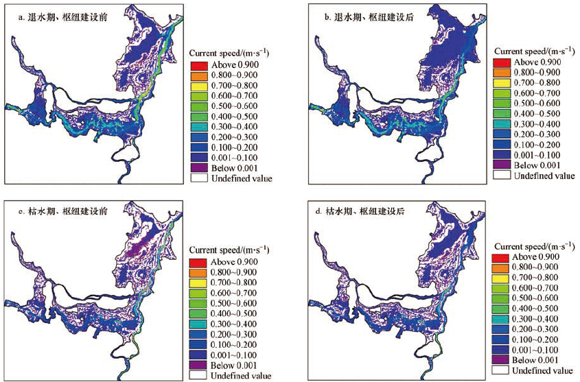 2)城陵磯樞紐工程運行后,與閘壩水力聯系緊密的東洞庭湖湖區,受閘壩蓄水頂托的影響,水體流速將變緩.枯水期由于水位抬升幅度較大,湖區水位維持在較高水平,各湖區水位差減小,流速降幅最為明顯.洞庭湖退水期、枯水期平均流速由0.30 m·s-1和0.23 m·s-1降至0.28 m·s-1和0.19 m·s-1,分別降低了6.67%、17.39%.
