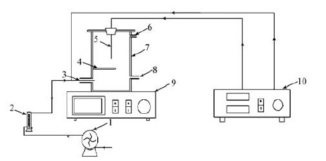 圖 1 實驗流程示意圖(1. 電磁式空氣泵;2. 空氣流量計;3. 針式中空高壓電極;4. 隔板;5. 接地電極;6. 排氣孔;7. 反應器;8. 取樣口;9. 磁力攪拌器; 10. 高壓電源)
