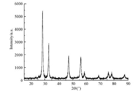 圖 2為制備的納米級Bi2WO6催化劑XRD圖譜,從圖 2可以看出,制備的Bi2WO6催化劑的衍射峰峰形明顯且峰角尖銳,該現象說明了合成產物有著高的結晶度.通過和標準圖譜對比,所有的衍射峰2θ分別為28.300、32.840、47.080、55.900、58.440、68.660、76.040、78.500、87.520,制備的Bi2WO6催化劑的XRD圖譜和PDF標準圖譜卡(JCPDS39-0256)相符合(Amano et al.,2008),且沒有其他的雜質峰出現,表明合成的催化劑純度很高,且晶體結構為純的正交相γ-Bi2WO6.