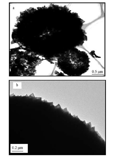 圖 4為鎢酸鉍的透射電鏡圖,圖 4a可以看出,微球體中心有空白區域,這說明微球體是中空結構,中凹空腔貫穿微球體.圖 4b為放大的微球邊緣的TEM電鏡圖,可以驗證,微球是由一個個近似長方形的納米片組成.
