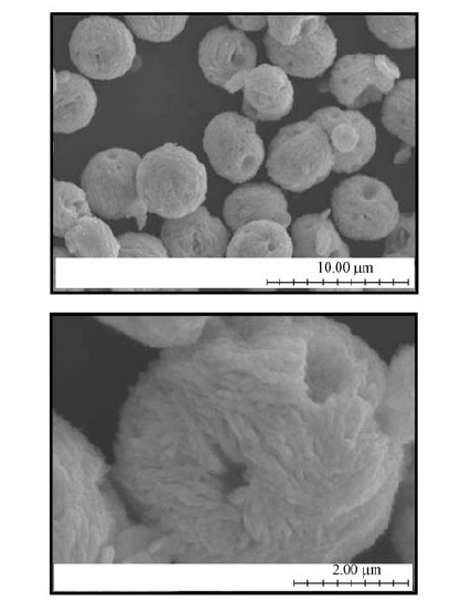 圖 3為制備鎢酸鉍的掃描電鏡圖,從圖 3可以看出,所制備的鎢酸鉍均為形貌均一的渦旋狀微球,各微球間分散性能良好.微球直徑大概為2 μm,且大小均一,每個微球都是由一個個大小均一、排列有序的納米片堆積而成,且為中凹結構.