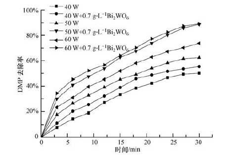 圖 6所示不同輸出功率對DMP降解率的影響,隨著輸出功率提高,DMP降解率逐步升高.輸出功率由40 W增加到60 W時,在等離子體放電體系中,DMP降解率由50%升高到73.1%,而在等離子體催化體系中,DMP降解率由55.3%增加到92.1%,加入鎢酸鉍的提高效果為5.2%、27.7%、19.1%.