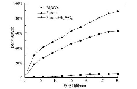 由圖 5可知,單獨鎢酸鉍催化劑對DMP溶液的吸附效果很差,反應30 min時,吸附率僅為5%,而對于等離子體放電體系和等離子體催化體系,隨著反應時間的延長,DMP降解率逐步升高,反應30 min時,單獨放電體系中,DMP降解率為62.3%,而在等離子體催化體系中,DMP降解率接近90%.可知,向等離子體放電體系中,加入鎢酸鉍催化劑可大大提高DMP降解率,除去鎢酸鉍對DMP的吸附作用,協同作用將DMP降解率提高了22.7%.這說明鎢酸鉍在等離子體催化體系中的作用是復雜的,并不是單一的吸附,鎢酸鉍在等離子體反應體系中的催化協同效果尤為顯著和突出.表 2的數據表明,3種體系對DMP的降解均符合一級動力學,等離子體催化體系降解DMP的一級動力學常數為0.1998 min-1,是等離子體放電體系降解DMP的動力學常數(0.096 min-1)的2.08倍,這也證明了等離子體放電和鎢酸鉍催化對DMP的協同降解作用.