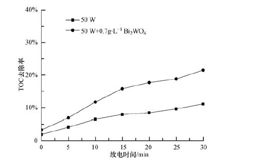 圖 11顯示了DMP降解過程中TOC的變化,隨著反應進行,TOC去除率不斷上升,放電30 min時,等離子體放電體系中TOC的去除率僅有10.5%,而在等離子體催化體系中TOC去除率為23.2%,TOC去除率升高了13%,由此可見,鎢酸鉍催化劑的加入可一定程度的促進DMP的礦化效果.同時,兩種體系中TOC的去除率都遠遠小于體系中DMP的去除率.這是由于雖然DMP分子大部分被降解,但是降解過程會生成許多中間小分子產物,部分中間產物較穩定,在反應結束時,也未能完全礦化成CO2和水,因此溶液的TOC去除率遠遠低于DMP的降解率(何東等,2014).具體參見污水寶商城資料或http://www.bnynw.com更多相關技術文檔。