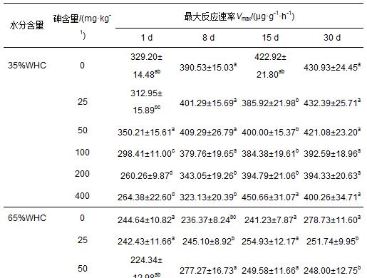 米氏常數(shù)Km表征酶與底物結合牢固程度,在數(shù)值上等于初速度達到最大反應速度1/2時的底物濃度.Km值越小,表明酶與底物結合越牢固,親合力越大(和文祥等,1997).從表 1可以看出:①不同水分下堿性磷酸酶Km總體呈現(xiàn)35%WHC>65%WHC>110%WHC的變化規(guī)律,3個水分下Km均值分別為6.08、4.78、3.66 mmol·L-1,表明隨水分含量增加,土壤堿性磷酸酶與底物的親和力增強,酶與底物更易結合.②除個別處理外,其余處理土壤堿性磷酸酶Km隨砷含量增加而顯著增大,表明砷污染導致堿性磷酸酶與底物親和力減弱.③不同處理下Km值雖有差異,但處于同一數(shù)量級,整個試驗處理中Km變幅為2.34~10.95 mmol·L-1.④不同培養(yǎng)時間的Km變化較小,如砷含量為100 mg·kg-1時,35%WHC、65%WHC、110%WHC下Km變化范圍分別為5.12~6.44、4.23~5.54、2.35~4.41 mmol·L-1,表明培養(yǎng)時間對土壤酶與底物親和力影響較弱.⑤相關分析顯示,35%WHC、65%WHC下砷含量與Km呈顯著相關(r>0.913*),而110%WHC下則相關性較差,表明干燥條件下砷顯著降低土壤酶與底物的親和力.