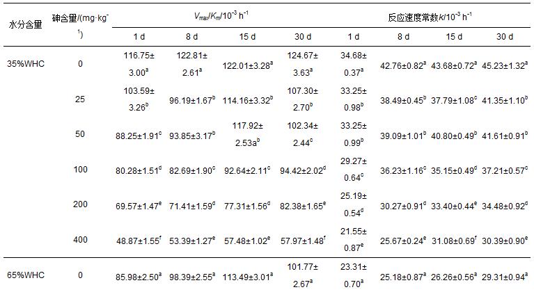 1)隨砷濃度增加,Km增大,Vmax(110%WHC)、Vmax/Km、k減小,表明砷污染不僅減弱了酶-底物的親和力,且減弱了酶-底物復合物的分解能力,減弱了酶促反應初速度,從本質上抑制了酶促反應的進行.
