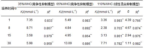 為進一步了解砷對磷酸酶的抑制特征,計算了不同條件下砷對土壤酶抑制常數(shù)Ki.Ki反映了抑制劑與酶形成復合物的親和力,其值越小,說明抑制劑與土壤酶結合形成中間復合物的親和力越強(和文祥等,2010).從表 6結果可以看出:①采用競爭性抑制模型(35%WHC、65%WHC)和線性混合抑制模型(110%WHC)擬合均達顯著或極顯著水平,揭示出不同水分含量下砷對堿性磷酸酶作用機理差異.②除第30 d外,其余處理110%WHC下Ki均小于35%WHC、65%WHC下,表明淹水增強了砷與土壤堿性磷酸酶的親和力.③35%WHC下Ki隨培養(yǎng)時間變化規(guī)律不明顯,65%WHC、110%WHC下Ki在培養(yǎng)后期(30 d)顯著大于前期(1~15 d),表明隨時間延長,砷與堿性磷酸酶的親和力減弱,對酶的抑制作用減輕,這與Vmax、Vmax/Km、k等隨時間變化所反映的規(guī)律一致.④比較Ki與Km可發(fā)現(xiàn),除65%WHC、110%WHC下第30 d外,其余處理Ki與Km相差不大;培養(yǎng)第30 d,65%WHC、110%WHC下Ki明顯大于Km,揭示出隨時間延長,酶與底物親和力強于酶與砷親和力.⑤110%WHC下,線性混合抑制模型求得的δ>1,表明酶-抑制劑對底物的親和力比酶對底物的親和力低,進一步揭示出線性混合抑制中非競爭性抑制為主要抑制方式(朱銘莪,2011;譚向平,2014).