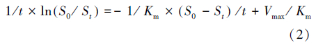 式中,t為酶促反應時間(h),S0、St分別是初始時刻和t時刻底物濃度(mmol·L-1).可見,上式是一條1/t×ln(S0/St)對1/t×(S0-St)的直線方程.在反應期間通過測定不同時間段利用的底物濃度(或生成的產(chǎn)物濃度),并通過線性回歸,即可求得Km和Vmax值.