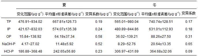 2)空間分布上,夏季TP含量由咸水端到淡水端呈現先降低后升高的趨勢,冬季則呈現先升高后降低的趨勢.IP冬夏季空間分布與TP相似;NaOH-P含量在冬夏兩季由咸水端到淡水端均呈現增高的趨勢;HCl-P在冬季淡水端含量較高.OP在夏季無明顯分布規律,冬季在咸水端含量較高.