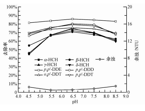 取OCPs濃度為200 ng · L-1、濁度為62 NTU的水樣1 L于燒杯中,用甲酸、氨水分別調其pH值為4.5、5.5、6.5、7.5、8.5,PASS投藥量為5 mg · L-1,按照2.5節方法進行混凝試驗,pH值與OCPs去除率之間的關系如圖 2所示. 由圖 2可知,OCPs的去除和原水pH值具有一定的關聯性,隨著pH值的升高,去除率先升高再降低,當pH=6.5時去除率最大.這可能是因為水中膠體顆粒的表面電荷和電位會隨著pH值的變化而發生改變,混凝劑的水解聚合反應也會受到pH值的影響,在pH=6.5時PASS的水解聚合形態達到了最佳,膠體的表面吸附或絮體的網捕卷掃作用也達到了最佳.pH<6.5或 pH>6.5 時,膠體的存在形態和混凝劑的水解形式也發生改變以致于混凝效果變差,去除率降低.
