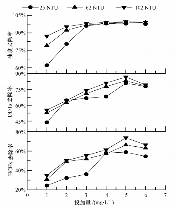 取OCPs初始濃度為200 ng · L-1、濁度分別為25、62、102 NTU的水樣1 L于燒杯中,調節pH值至6.5,按照2.5節方法進行混凝試驗,濁度與OCPs去除率之間的關系如圖 3所示.圖 3結果表明:OCPs和濁度的去除率均隨原始濁度的增加而增加,當原始濁度為25 NTU時,二者的去除率明顯低于濁度為62 NTU和102 NTU的情況.試驗中加入高嶺土來模擬水樣濁度,高嶺土顆粒作為水中膠體顆粒和懸浮物質一方面發揮著吸附作用,濁度的升高意味著高嶺土顆粒數量的增大,這也勢必增加了活性吸附點,更有利于OCPs在高嶺土上發生吸附共沉作用;另一方面,高嶺土顆粒物的增加大大提高了膠體的聚集速率,生成更多的絮體,在發揮共沉淀作用的同時,網捕卷掃作用明顯加強.綜上所述,濁度的大小會影響混凝對水中微量OCPs的去除.
