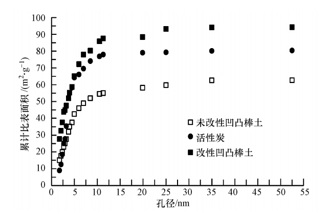 通過比較可以發現,相對于活性炭,改性凹凸棒土的總孔體積和中大孔體積較大,說明改性凹凸棒土的中大孔(>2 nm)比活性炭發達.而中大孔決定著水處理過程中液相吸附速率,因為混凝工藝中一般停留時間不超過30 min,在固-水介質中,中大孔作為接觸載體,為吸附質的擴散提供通道,起到了關鍵作用,吸附質通過此通道才能擴散到微孔中去.