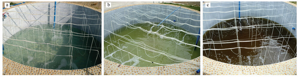 圖 1 顆粒直鏈藻水華在人工池中的誘發(fā)過程(a.接入藻種前,b.水華爆發(fā)前,c.水華爆發(fā)后)