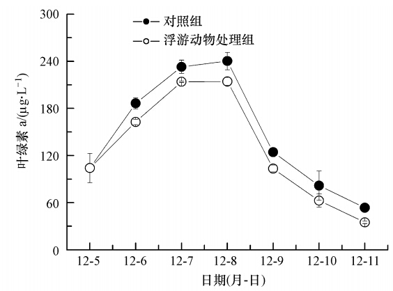 待池中水體的葉綠素a濃度增加到(104.15±18.63)μg · L-1時接入以婆羅異劍水蚤為主的浮游動物. 盡管其在浮游植物細胞濃度已經(jīng)很高的情況下已不能抑制水華的發(fā)生,但其攝食作用對浮游植物細胞濃度的增加仍表現(xiàn)出明顯的抑制效應(yīng)并使其消退加速(圖 3).添加浮游動物組水體的葉綠素a比對照組(未添加浮游動物)低18.62~26.08 μg · L-1,平均為21.24 μg · L-1,且差異顯著(p<0.05).