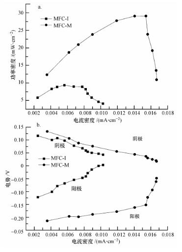圖 2 穩(wěn)定運(yùn)行階段MFC-I和MFC-M的功率密度(a)與陰、陽極極化曲線(b)