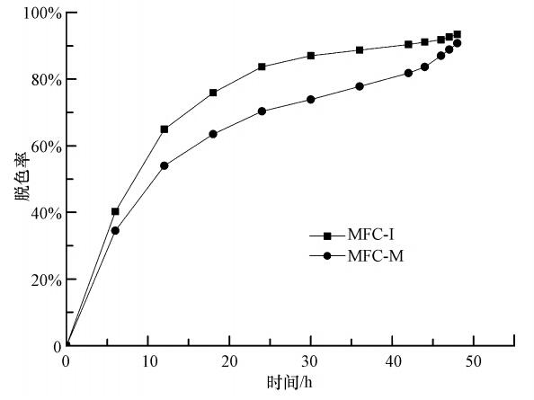 圖 3 穩(wěn)定運(yùn)行階段兩種接種源MFC對(duì)剛果紅的脫色率-時(shí)間曲線