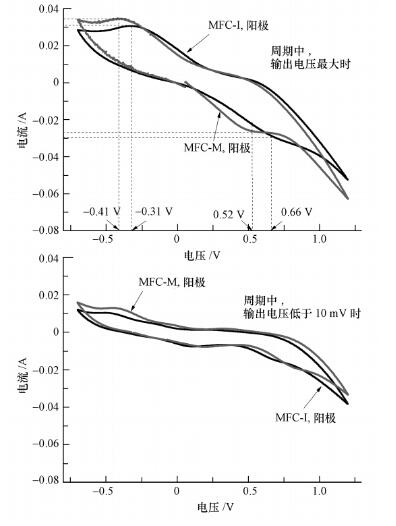 圖 6 穩(wěn)定運(yùn)行階段最大電壓時(shí)(a)和周期末(b)MFC-I和MFC-M陽極的循環(huán)伏安曲線