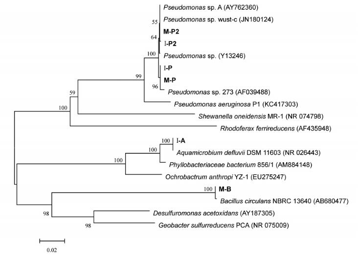 從MFC-M和MFC-I陽極各分離出3株純菌,分別命名為M-P、M-P2、M-B和I-P、I-P2、I-A,繪制系統(tǒng)發(fā)育樹如圖 8所示.由圖可知,MFC-M的優(yōu)勢菌為Pseudomonas sp.(M-P、M-P2)和Bacillus sp.(M-B);MFC-I的優(yōu)勢菌為Pseudomonas sp.(I-P、I-P2)和Aquamicrobium sp(I-A).其中,I-P和M-P、I-P2和M-P2、I-P和I-P2、M-P和M-P2、I-A和I-P、I-A和M-B、M-B和M-P的同源相似性分別為100%、99%、99%、99%、83%、81%、80%.可見,在一定的環(huán)境條件下,接種源微生物多樣性與特征基質(zhì)決定了MFC陽極優(yōu)勢菌種.