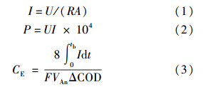式中,I為單位面積電流密度(mA · cm-2),U為外電路電壓(V),R為電阻(Ω),A為電極面積(cm2),P為單位面積功率密度(mW · m-2),F(xiàn)為法拉第常數(shù)(C · mol-1),VAn為陽極室液體體積(cm3),tb為周期時(shí)間(s),ΔCOD為周期初與周期末的COD變化值(mg · L-1),CE為庫倫效率.
