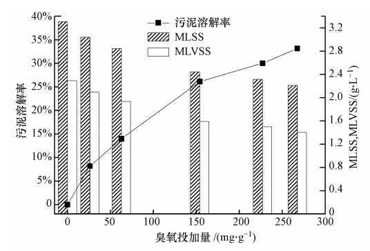 首先考察了不同臭氧投加量對污泥溶解率的影響.如圖 1所示,隨著臭氧投加量的增加,污泥的MLSS和MLVSS逐漸減小,污泥溶解率逐漸增大.當臭氧投加量在0~154 mg · g-1時,溶解率增加較快,由0增加到26%;當臭氧投加量在154~268 mg · g-1時,污泥溶解率增加較慢,由26%增加到33%.為了在獲得較好污泥減量效果的同時盡可能降低污泥臭氧處理的成本,建議合理的臭氧投加量為150 mg · g-1左右.