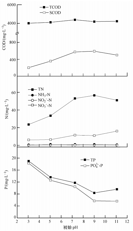 圖 4顯示了初始pH對臭氧處理后污泥中COD、氮和磷溶出的影響.臭氧處理前,污泥的TCOD和SCOD分別為4245和18 mg · L-1,TN、NH3-N、NO-2-N和NO-3-N分別為12.00、0.25、0.05、5.05 mg · L-1,TP和PO3-4-P分別為0.68和0.60 mg · L-1.