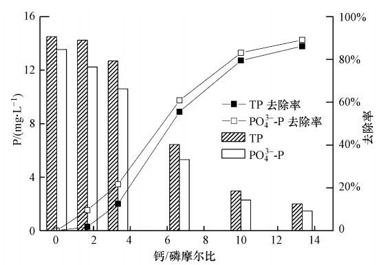 如前所述,當生物處理系統剩余污泥零排放時,出水中磷濃度將逐步升高,因此,需要增加除磷工藝,使出水TP達標.圖 7初步考察了鈣磷摩爾比對除磷效果的影響.由圖可知,隨著鈣磷摩爾比的增大,上清液中的TP和PO3-4-P逐漸降低,鈣磷摩爾比在3.3~10.0時,磷去除率增加較快,在0~3.3和10.0~13.3時,去除率增加較緩.鈣磷摩爾比在10.0以上時,TP和PO3-4-P的去除率均超過80%.