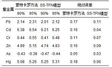 為了驗證采用蒙特卡羅方法和三角模糊數耦合模型比單純的運用蒙特卡羅方法進行隨機模擬的優越性,本文在模擬計算40000次的情況下,分別計算概率為90%與95%時各種重金屬地累積指數模擬結果之間的絕對誤差值,結果見表 10.