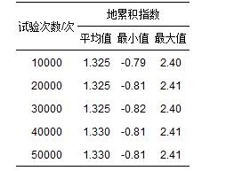 將表 5中經三角模糊數處理后的重金屬監測數據和地球化學背景值,根據2.2.2節的處理方法,利用Crystal Ball模擬軟件進行隨機模擬.根據式(5),可得到地累積指數的隨機模擬序列{Ij j=1,2,…,m },m為隨機模擬的試驗次數.分別進行10000、20000、30000、40000、50000次隨機模擬,如重金屬Pb的模擬結果如表 6所示.