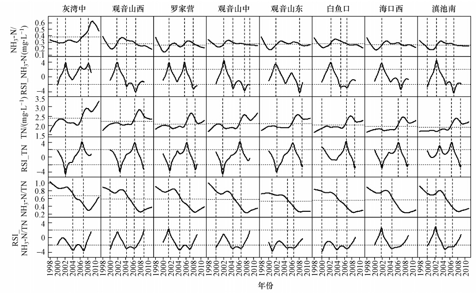 圖 5展示了NH3-N、TN和NH3-N/TN的變化趨勢及RSI結果.由圖可知,灰灣中NH3-N平均值顯著高于其它站點,且變化趨勢亦異于其它站點.灰灣中NH3-N濃度經歷1次顯著下降和3次顯著上升過程,至2009年達到最大值,符合III類水質標準;其他站點NH3-N濃度變化趨勢一致,在平均值附近波動,2008年后呈現下降趨勢.