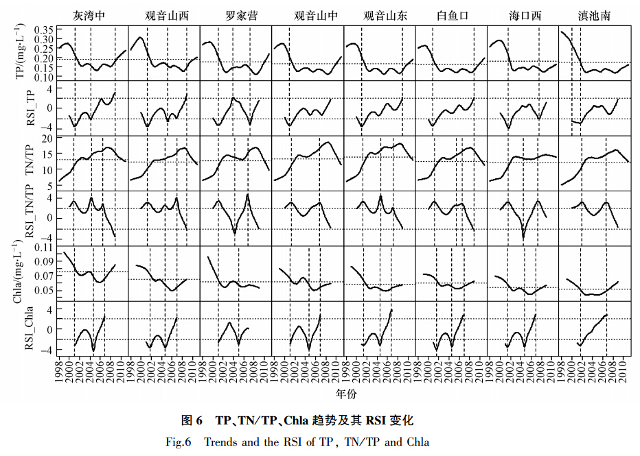 Chla濃度總體呈現先下降后上升的趨勢,在2006年達到波谷,灰灣中Chla濃度明顯高于其它站點.從RSI圖上看,下降過程中經歷了2次顯著下降,在2007年附近存在顯著的升高趨勢(除羅家營站).Chla是表征水體中藻類濃度的指標;有學者探討了氮磷比與藻類生長之間的關系,認為氮磷比是湖泊水華的限制因子,如Smith提出適宜藍藻生長的TN/TP值為10~16,適合真核藻類生長的比例為16~23(胡鴻鈞,2011);由此分析,理論上滇池的氮磷比應該適宜藍藻生長.但Chla的變化趨勢并不支持這種理論,說明該理論對于滇池并不適應.從TN、TP和Chla的趨勢圖上可以看出,2003年之前TP和Chla的下降具有很好的協同性,而2006年之后TN和Chla的升高具有很好的一致性,說明滇池藻類的生長受到磷、氮的共同影響,但影響的時間階段不同,且近年來氮已成為滇池藻類爆發的限制性因素.這一結論與之前的研究相同(萬能等,2007;顏小品等,2013),但尚需細致的實驗數據進一步驗證.