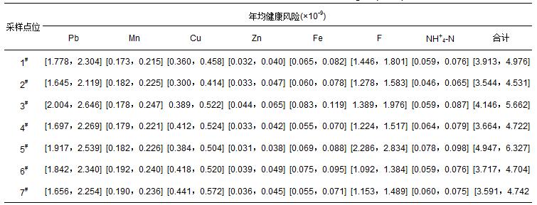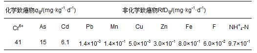 水源地有毒污染物按照水樣檢出與否,選取Cr6+、As、Cd、Pb、Mn、Cu、Zn、Fe、F、NH+4-N等10項檢出污染物作為健康風險指標,其中,Cr6+、As、Cd為化學致癌物,Pb、Mn、Cu、Zn、Fe、F、NH+4-N為非致癌化學有毒物.As采用原子熒光光譜儀測定,Cr、Cd、Pb、Mn、Cu、Zn、Fe采用原子吸收光譜儀測定,NH+4-N采用納氏試劑分光光度法測定,F采用離子色譜儀測定.為了保證數據的準確性,進行了平行樣的測定,結果表明,RSD均小于10%,準確程度符合要求.具體監測濃度統計結果如表 1所示.