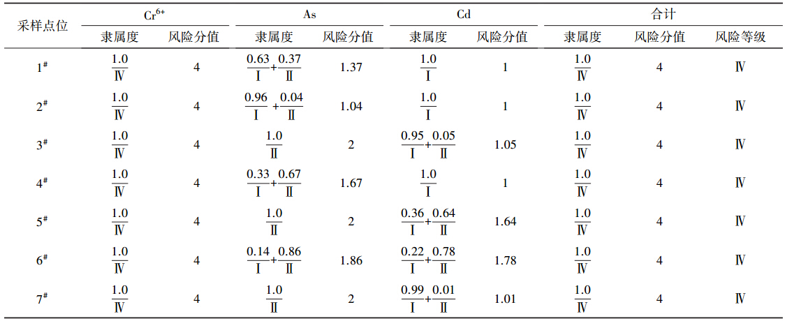 由公式(4)可以確立各個采樣點的污染指標對各個評價等級的隸屬度,再由公式(5)得到各個采樣點的污染指標的風險值及其風險等級.化學致癌物健康風險隸屬度及風險值結果如表 6所示.
