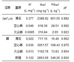 Langmuir等溫吸附模型中的K值為吸附結合能,K值越大,表示填料與溶質的結合越穩定.從表 4可以看出,各填料與NH+4-N之間的結合能大小順序為沸石>空心磚>火山巖;各填料與磷之間的結合能大小順序為鋼渣>空心磚>沸石>火山巖.Kqmax為最大緩沖容量,反映固液體系吸附溶質時的緩沖能力(趙桂瑜,2007).將各填料進行比較,對NH+4-N緩沖容量最大的填料為沸石,對磷緩沖容量最大的為鋼渣,空心磚次之.這說明即使溶液污染物濃度變化較大時,這些填料對相應污染物仍能維持較好的去除效果.因此,沸石是較好凈化NH+4-N,鋼渣、空心磚是較好的凈化磷的人工濕地填料.
