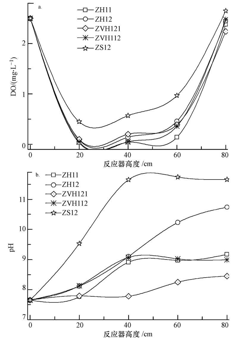 運行穩定后,反應器中不同填料段DO與pH的變化如圖 2所示.DO在各反應器分布趨勢基本相似,在各段的數值上存在差異.DO在不同填料段的濃度具有明顯的空間特征,導致反應器在不同段形成了厭氧、缺氧、好氧交替的環境,這對微生物的生物降解、硝化、反硝化作用具有較大的影響.在各反應器底部20 cm處DO濃度均在0.5 mg · L-1以下,ZH11、ZH12、ZVH112、ZVH121的填料組合方式中,底部DO濃度達到了0.2mg · L-1以下.這說明當污水進入反應器后,DO被迅速消耗,在各反應器0~40 cm間形成了一個厭氧環境.同時隨著反應器高度的增加,反應器中DO濃度有所升高,在反應器頂端接觸空氣處達到最大值,各反應器頂部80 cm處的DO濃度維持在2.24~2.65 mg · L-1之間,這是由于大氣復氧導致DO濃度的升高.同時,由于該處污水可生化性已經較差,污染物不再耗氧分解.