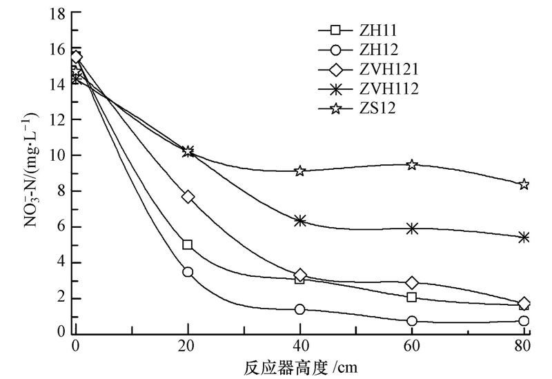 反應器中NH+4-N的去除有兩種途徑:第一,通過反應器中填料的吸附去除;第二,通過微生物的同化、硝化等作用被微生物自身利用或轉化為NO-3-N和NO-2-N(Ahn,2006).人工濕地運行前期NH+4-N主要通過填料吸附,但通過一段時間的運行后,微生物起到了主要去除NH+4-N的作用.圖 4展示了NH+4-N在反應器豎直方向上的變化,除含鋼渣的填料組合外,其它組合變化規律相似,在0~40 cm去除NH+4-N較多,說明各反應器在此段的生物量較為豐富,除基質吸附的部分外,一部分的NH+4-N通過微生物作用得到去除.而含鋼渣的ZS12組合由于pH在40 cm迅速的升高,不僅對微生物產生巨大影響,并且導致溶液中平衡NH+4+OH-NH3·H2O向右移動,填料對NH+4-N的吸附效果降低,影響NH+4-N的總體去除效果.武俊梅等(2010)對多種填料進行了實驗,發現沸石對NH+4-N的去除效果顯著高于其它填料,而鋼渣會使溶液pH上升,對NH+4-N去除效果較差.含有空心磚的組合由于pH沿反應器豎直方向上升的較為緩慢,大部分的NH+4-N在反應器底部已經得到有效的去除,pH在反應器頂部的升高并不會影響NH+4-N的出水濃度.