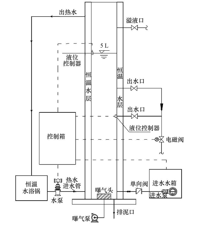反應(yīng)器有效容積5 L,內(nèi)徑為100 mm,總高850 mm(圖 1).SBR運(yùn)行參數(shù):自控裝置控制運(yùn)行周期,處理水量為2.5 L · 周期-1,每周期6 h,包括進(jìn)水5 min,曝氣240 min,靜沉75 min,排水10 min,靜置30 min;溫度(25.0±0.5)℃.進(jìn)水水箱中設(shè)有循環(huán)泵,確保進(jìn)水成份均勻.曝氣時(shí)控制反應(yīng)器內(nèi)DO≥2 mg · L-1.實(shí)驗(yàn)過(guò)程中平均1天排1次泥,保證MLSS為5000 mg · L-1左右,污泥齡約為6 d.